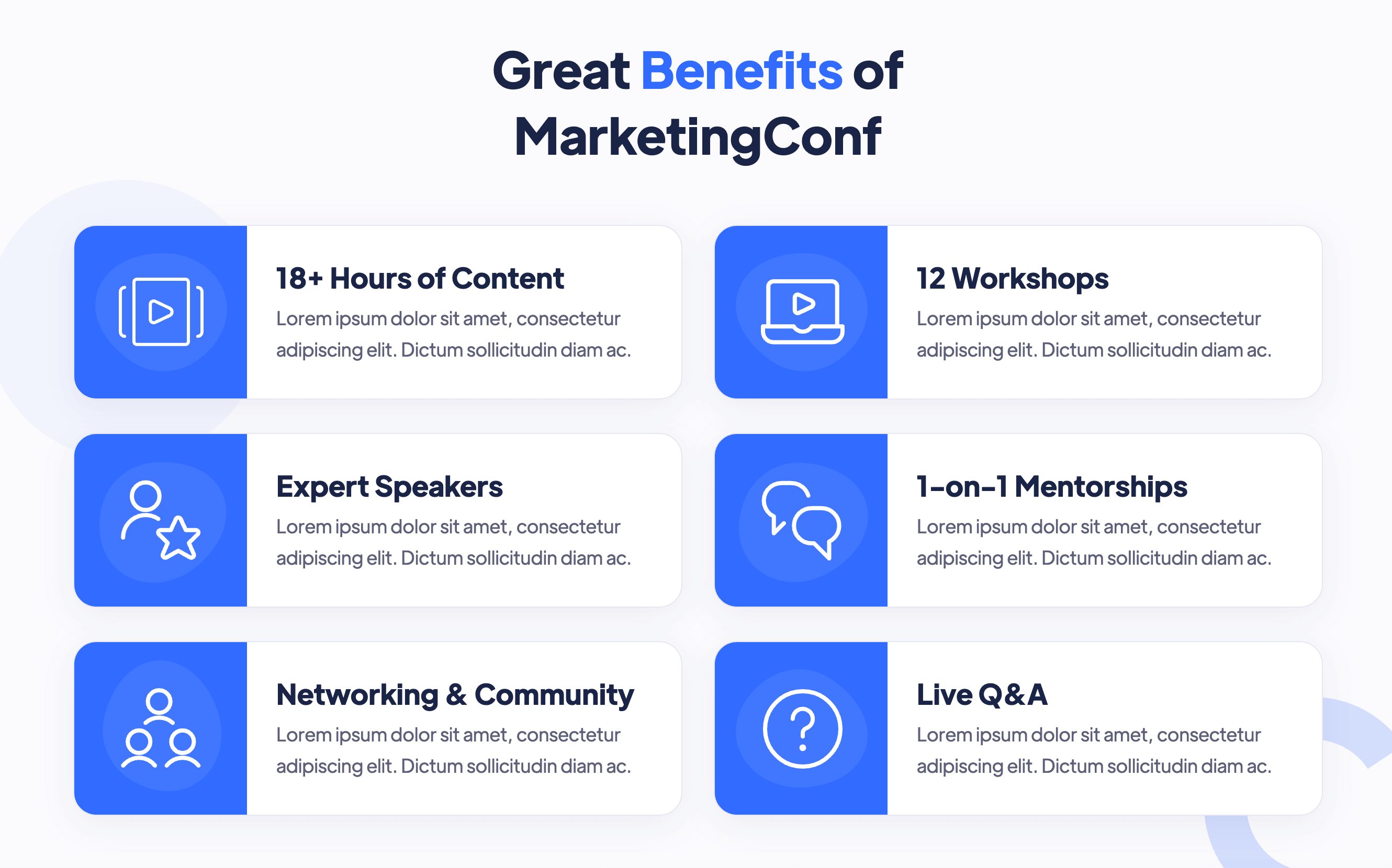 Evently was created to include everything you need to host your online conferences, including pages like Speakers, Agenda, Tickets, and much more.